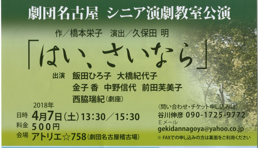 出演情報!西脇 瑞紀が「はい、さいなら」に出演します! 公開済み: 2018年3月31日更新: 2018年4月14日作成者: gekizaカテゴリー: 過去出演情報タグ: 西脇瑞紀 劇団名古屋 シニア演劇教室公演「はい、さいなら」 に、西脇 瑞紀が出演します! 作:橋本 栄子 演出:久保田 明 日時:2018年 4月7日(土)13:30/15:30 場所:アトリエ☆758(劇団名古屋稽古場) 料金:500円 お問合せ先: TEL:090-1725-9772 関連記事 16 仮面によるギリシア悲劇オイディプース王 悲劇的な運命に洗われながら人間としての尊厳と栄光を貫く男の物語 仮面によるギリシア悲劇「オイディ […] 公開済み: 2008年12月16日更新: 2016年3月29日作成者: gekizaカテゴリー: 過去出演情報タグ: 天野鎮雄 出演情報!加藤綾子が「オペラ まほうのふえをふきならせ」に出演します! 「オペラ まほうのふえをふきならせ」 指揮:柴田 祥 台本・演出:齋藤 敏明 作曲:押山 晶子 […] 公開済み: 2016年3月6日更新: 2016年3月28日作成者: gekizaカテゴリー: 過去出演情報タグ: ミュージカル, 加藤綾子 出演情報!麓 貴志が「薄暮夢」に出演します! オブジェクトパフォーマンスシアター『薄暮夢』 演出:木村 繁 美術監督:福永 朝子 日時:20 […] 公開済み: 2016年7月11日更新: 2016年9月22日作成者: gekizaカテゴリー: 過去出演情報タグ: 麓貴志 この投稿へのトラックバック トラックバックはありません。 トラックバック URL