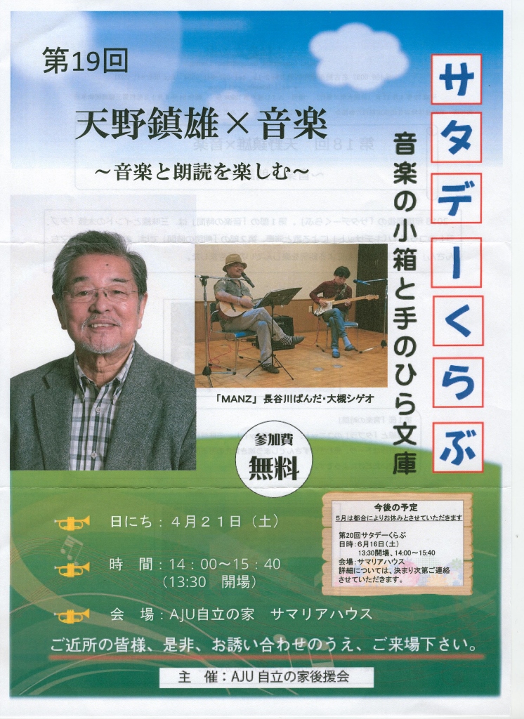 「第19回サタデーくらぶ 音楽の小箱と手のひら文庫」に、天野 鎮雄が出演します!